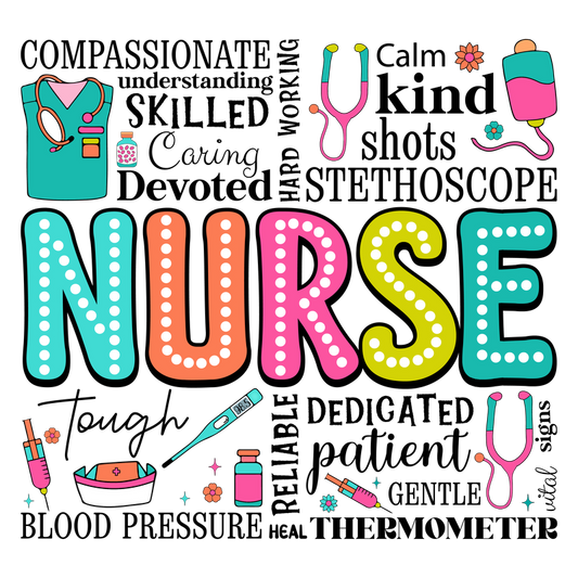 A colorful and playful design featuring the word "NURSE," surrounded by fun illustrations of medical tools and supplies.DTF Transfers