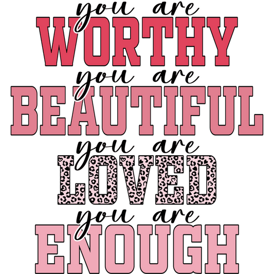 A vibrant, inspirational design featuring affirmations: "Worthy, Beautiful, Loved, Enough," with playful typography and a mix of colors and patterns.DTF Transfers