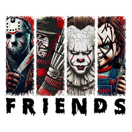A colorful illustration featuring iconic horror characters: Jason Voorhees, Freddy Krueger, Pennywise, and Chucky, all in a chilling style. dtf transfers
