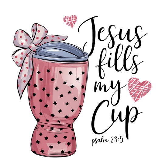 Regular price From £0.75 GBPRegular priceUnit price / per£2.40 GBPSale price From £0.75 GBPA charming pink tumbler with stars, topped with a blue lid and a bow, celebrates the message "Jesus fills my Cup."DTF Transfers
