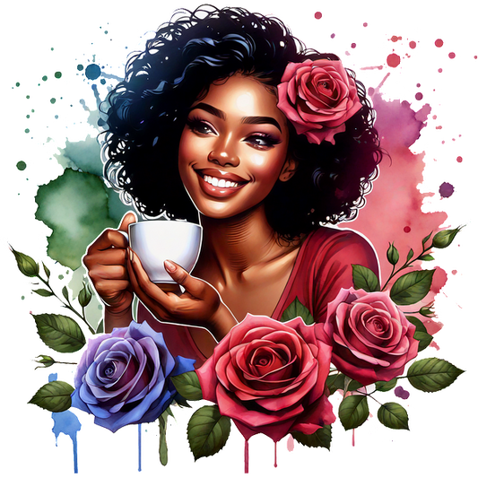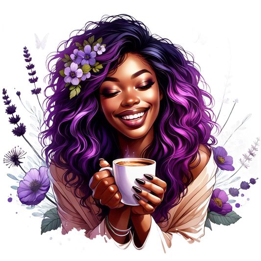 Regular price From £0.75 GBPRegular priceUnit price / per£2.39 GBPSale price From £0.75 GBPA cheerful woman with long purple hair holds a steaming cup of coffee, surrounded by vibrant flowers, exuding warmth and joy. dtf transfers