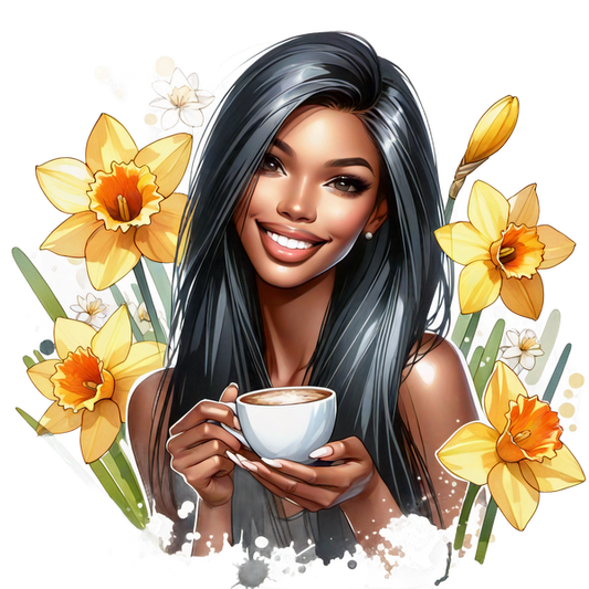 Regular price From £0.75 GBPRegular priceUnit price / per£2.39 GBPSale price From £0.75 GBPA cheerful woman with long black hair smiles while holding a cup of coffee, surrounded by vibrant yellow daffodils. heat press transfers