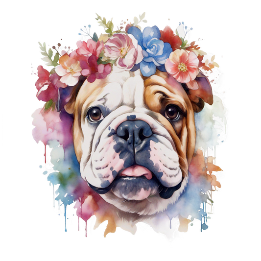 Regular price From £0.75 GBPRegular priceUnit price / per£2.39 GBPSale price From £0.75 GBPA charming illustration of an adorable bulldog adorned with a colorful floral crown, surrounded by vibrant watercolor splashes. dtf prints