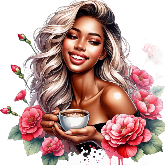 Regular price From £0.75 GBPRegular priceUnit price / per£2.39 GBPSale price From £0.75 GBPA joyful woman with flowing blonde hair holds a cup of coffee, framed by vibrant pink flowers. heat press transfers