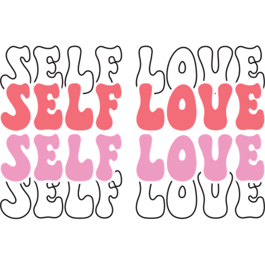 A vibrant graphic design featuring the words "SELF LOVE" in playful, colorful lettering, conveying a positive message of self-acceptance. dtf prints