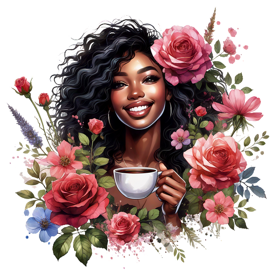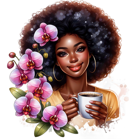 Regular price From £0.75 GBPRegular priceUnit price / per£2.39 GBPSale price From £0.75 GBPA cheerful woman with a beautiful afro holds a cup of coffee, surrounded by vibrant pink orchids, radiating warmth and joy. dtf prints