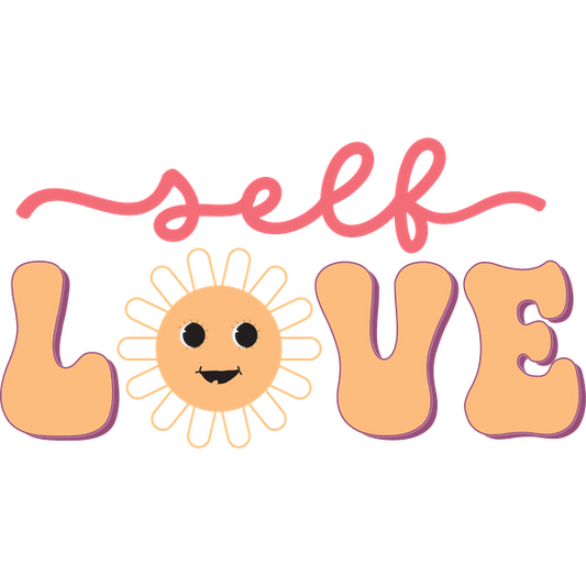 A colorful and cheerful design featuring the words "self love" with a smiling sun accent, promoting positivity and self-acceptance. heat press transfers