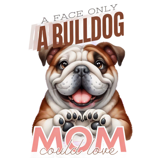 Adorable cartoon bulldog with a heartwarming smile, captioned “A face only a bulldog mom could love,” perfect for dog lovers. heat press transfers