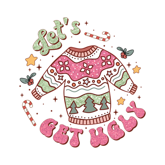 A playful illustration of an ugly sweater, adorned with festive patterns and the words "Let's Get Ugly" in bright colors. heat press transfers