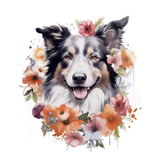 Regular price From £0.75 GBPRegular priceUnit price / per£2.39 GBPSale price From £0.75 GBPA cheerful border collie surrounded by vibrant flowers, creating a joyful and colorful floral portrait. heat press transfers