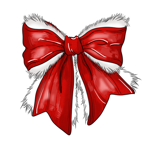 A festive red bow adorned with fluffy white trim, perfect for holiday decorations and special gifts. heat press transfers