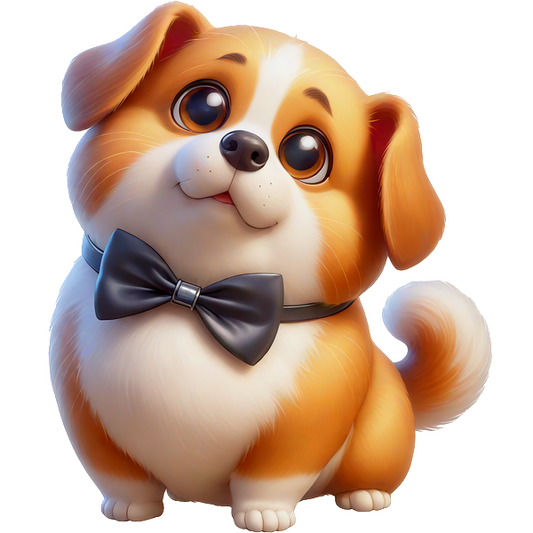 Adorable cartoon dog with a shiny coat, big expressive eyes, and a stylish black bow tie. Perfectly charming! dtf prints