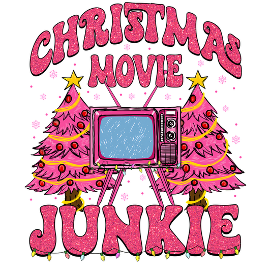 Celebrate the holiday spirit with this fun graphic featuring a retro TV, Christmas trees, and the phrase "Christmas Movie Junkie." dtf prints