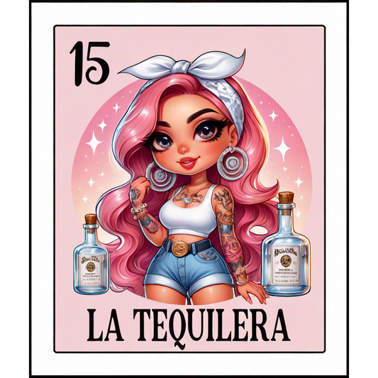 Regular price From £0.75 GBPRegular priceUnit price / per£2.39 GBPSale price From £0.75 GBPA vibrant illustration featuring a stylish young woman with pink hair and tattoos, framed by two tequila bottles and the title "La Tequilera." dtf prints