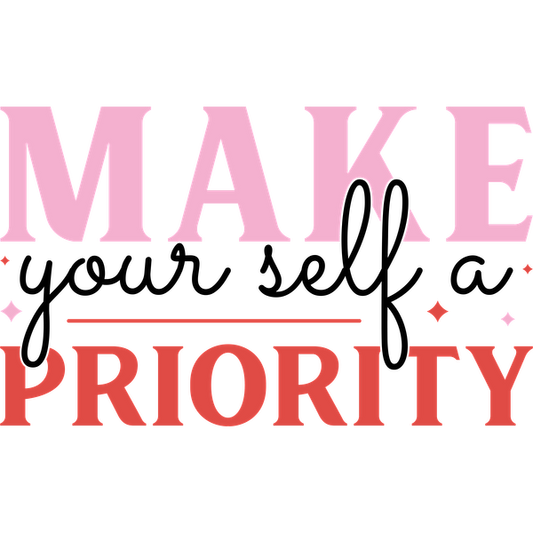 A vibrant and playful design featuring the phrase "MAKE PRIORITY," combining pink and red colors for an eye-catching effect. dtf transfers