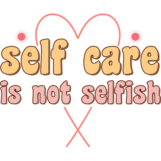 A playful design emphasizing the importance of self-care with the message "self care is not selfish" in colorful text. dtf prints
