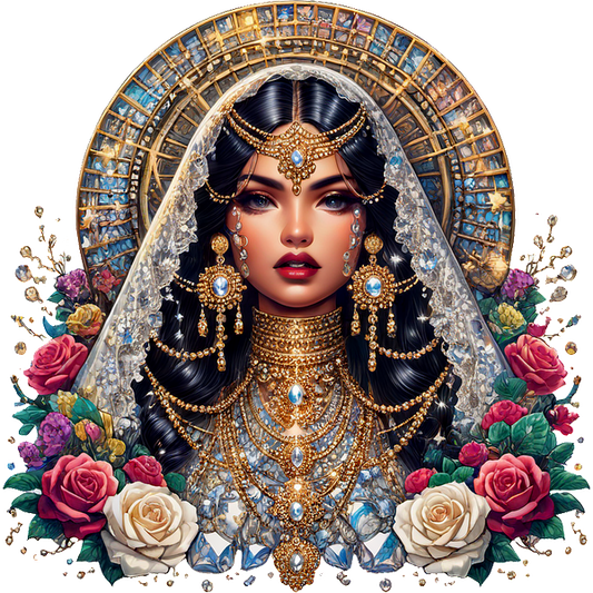 Regular price From £0.75 GBPRegular priceUnit price / per£2.39 GBPSale price From £0.75 GBPA beautifully detailed illustration of a woman adorned in intricate gold jewelry and a veil, surrounded by vibrant roses and floral accents.dtf regular iron