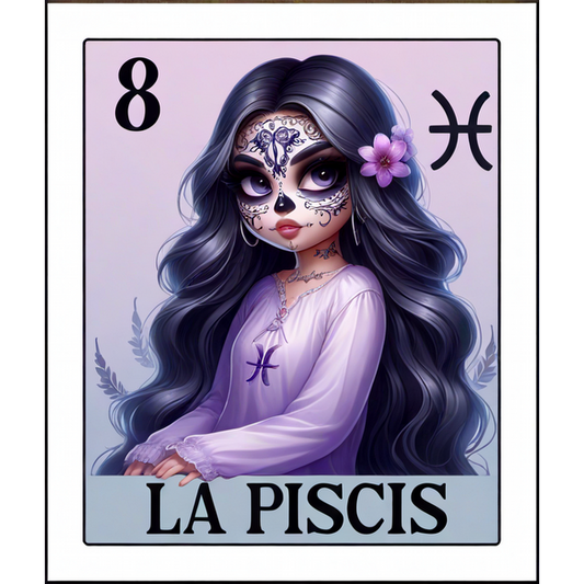 Regular price From £0.75 GBPRegular priceUnit price / per£2.39 GBPSale price From £0.75 GBPA whimsical illustration representing the Pisces zodiac sign, featuring a girl with sugar skull makeup and long, wavy hair. dtf transfers