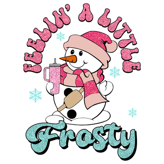 A cheerful snowman in a pink scarf and hat, holding a drink, with sparkling text that reads "Feelin' A Little Frosty." dtf transfers