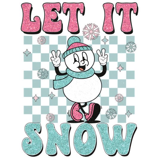A cheerful snowman in a hat and scarf playfully poses with "Let It Snow" in sparkling lettering and playful snowflakes.dtf regular iron