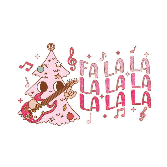 A whimsical pink Christmas tree character joyfully playing guitar, surrounded by musical notes and festive "Fa la la la" text. heat press transfers