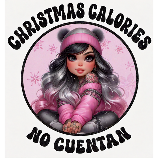 A cheerful illustration featuring a girl in a pink sweater and beanie with the playful quote "Christmas calories no cuentan." heat press transfers