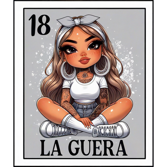 Regular price From £0.75 GBPRegular priceUnit price / per£2.39 GBPSale price From £0.75 GBPA vibrant illustration of a tattooed girl styled as "La Guera," featuring trendy attire and a playful expression. heat press transfers