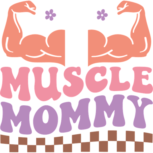 A vibrant design featuring "Muscle Mommy" text and strong arm illustrations, celebrating strength and empowerment in a playful style. heat press transfers
