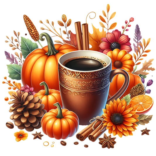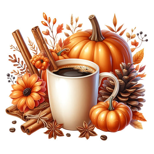 Cozy autumn-themed arrangement featuring a steaming cup of coffee surrounded by pumpkins, flowers, pinecones, and cinnamon sticks.dtf regular iron
