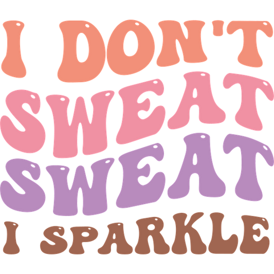 Playful and colorful text art stating "I Don't Sweat, I Sparkle," perfect for those who embrace positivity and fun! dtf transfers
