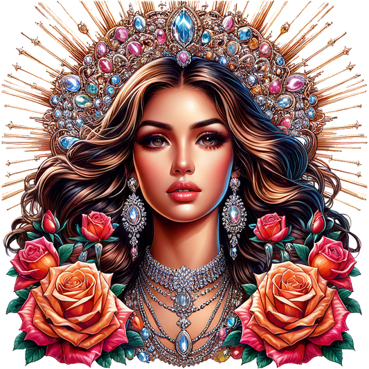 Regular price From £0.75 GBPRegular priceUnit price / per£2.39 GBPSale price From £0.75 GBPA stunning illustration of a woman adorned with intricate jewelry and roses, radiating beauty and elegance with a golden backdrop. dtf prints