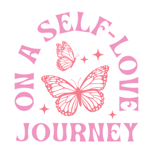 A vibrant pink design featuring butterflies and the phrase "On a Self-Love Journey," promoting positivity and self-care. dtf prints