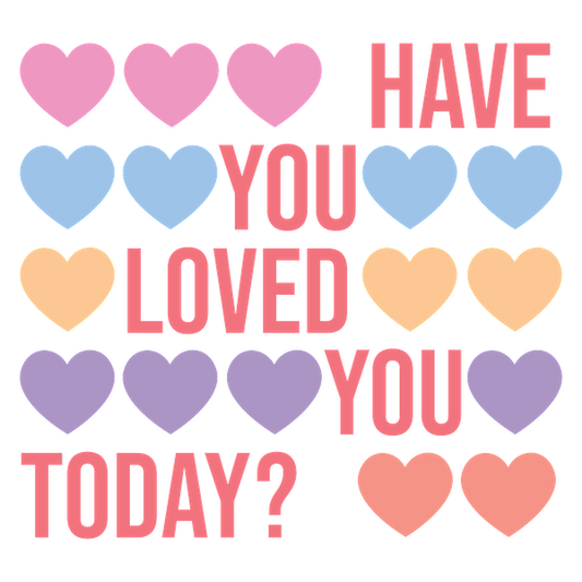 A colorful and playful design featuring various hearts with the uplifting message, "Have you loved you today?"dtf regular iron