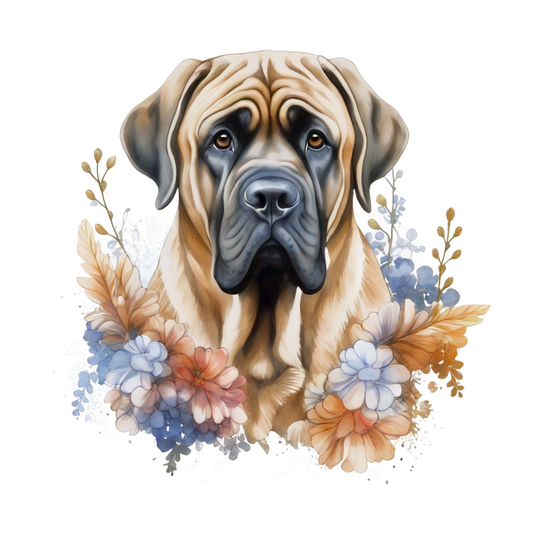 A beautiful illustration of a Bullmastiff surrounded by colorful flowers, showcasing the dog's expressive face and gentle demeanor. heat press transfers
