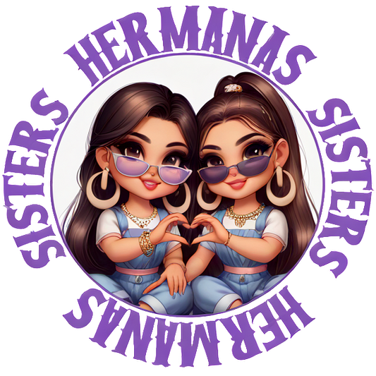 Adorable cartoon sisters stylishly dressed, sharing a heart gesture, surrounded by the words "Sisters" and "Hermanas" in bold purple letters. dtf prints