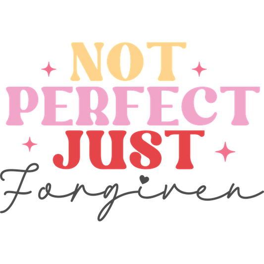A vibrant graphic featuring the uplifting message "Not Perfect Just Forgiven" in colorful letters with decorative accents.dtf regular iron