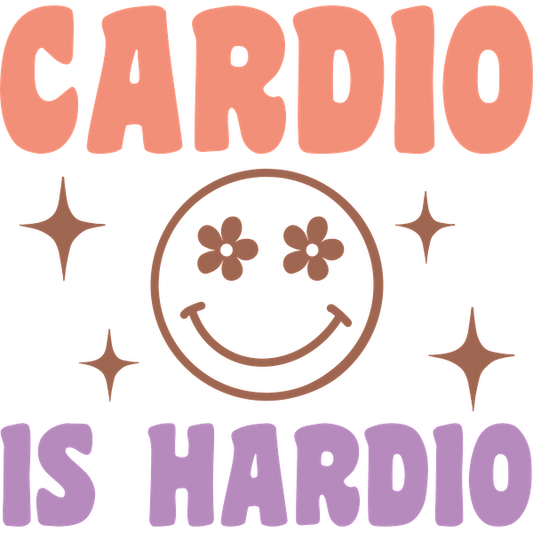 A colorful and playful graphic featuring the phrase "Cardio is Hardio" alongside a cheerful smiling face with flowers. dtf prints