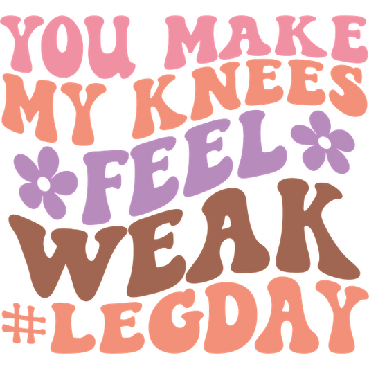 A colorful, playful graphic featuring the phrase "You make my knees feel weak #LegDay," decorated with cheerful flower motifs. heat press transfers