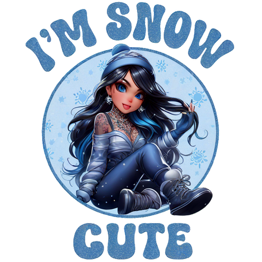 Regular price From £0.75 GBPRegular priceUnit price / per£2.39 GBPSale price From £0.75 GBPA whimsical winter-themed graphic featuring a cute character in a cozy outfit, surrounded by the text "I'M SNOW CUTE." dtf prints