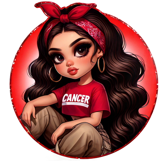 A stylish cartoon character with long, wavy hair and a red bandana, wearing a red "CANCER" tee and tan pants. heat press transfers