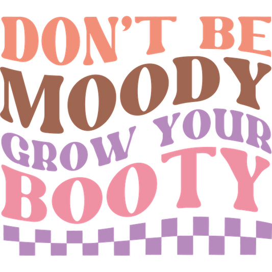 A playful text design encouraging positivity with the message "Don't be moody, grow your booty," in vibrant colors and bold fonts. heat press transfers