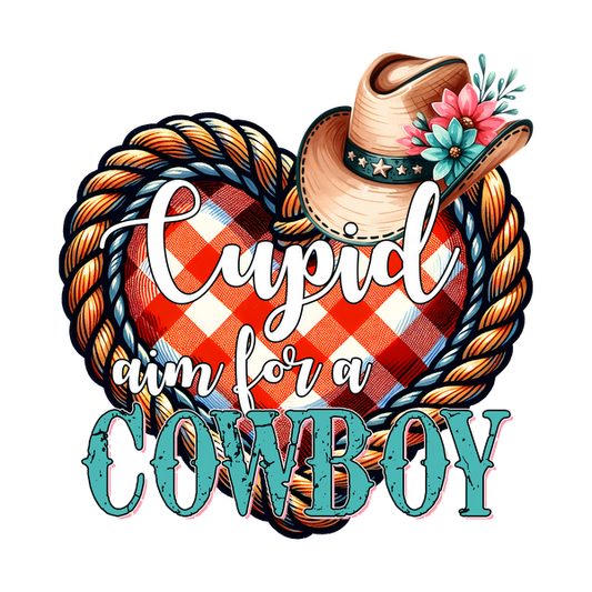 Heart-shaped graphic featuring a cowboy hat, floral accents, and the playful phrase "Cupid aim for a Cowboy" in vibrant colors. heat press transfers