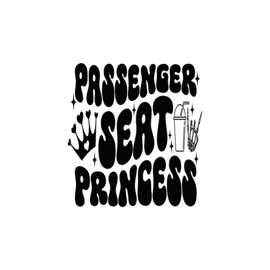 A fun graphic reading "Passenger Seat Princess," featuring playful lettering and whimsical elements like a crown and beverage icon.dtf regular iron