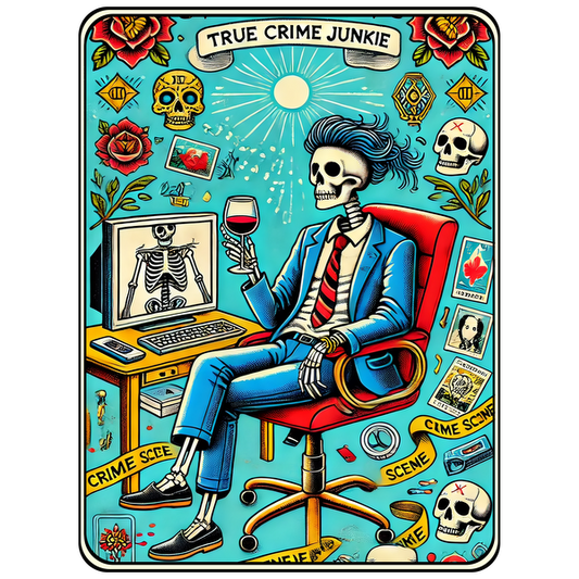 Regular price From £0.74 GBPRegular priceUnit price / per£2.38 GBPSale price From £0.74 GBPA vibrant, quirky illustration featuring a stylish skeleton in a suit, enjoying wine while seated at a computer, surrounded by crime-themed elements. heat press transfers