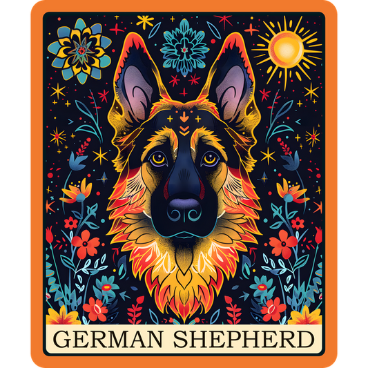 Regular price From £0.74 GBPRegular priceUnit price / per£2.38 GBPSale price From £0.74 GBPVibrant and colorful illustration of a German Shepherd surrounded by flowers and stars, capturing a whimsical and artistic style.