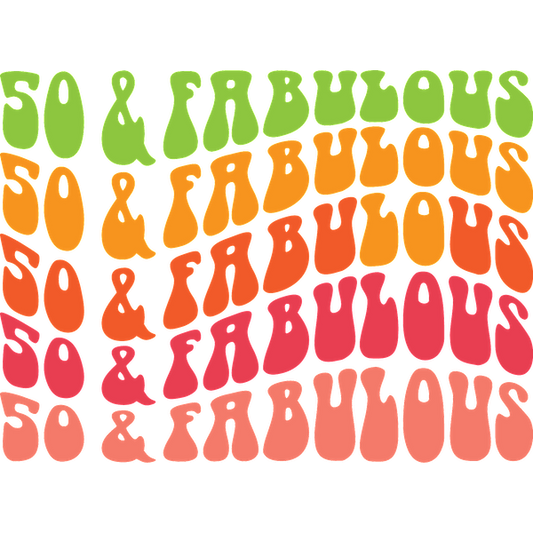 A vibrant and playful graphic featuring the phrase "50 & Fabulous" in bold, colorful, retro-style lettering. dtf transfers