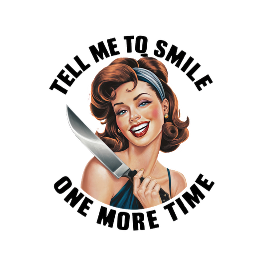 Regular price From £0.74 GBPRegular priceUnit price / per£2.38 GBPSale price From £0.74 GBPA playful vintage-inspired graphic features a smiling woman holding a knife, surrounded by the phrase "Tell me to smile one more time." dtf prints