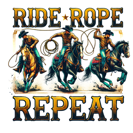 Regular price From £0.74 GBPRegular priceUnit price / per£2.38 GBPSale price From £0.74 GBPA vibrant graphic featuring cowboys on horseback, showcasing the motto "Ride, Rope, Repeat" with dynamic action and colorful details. dtf transfers
