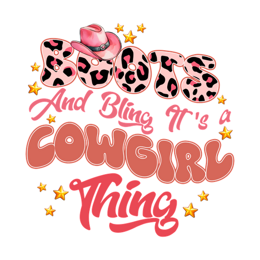 Celebrate your inner cowgirl with this fun and vibrant graphic featuring the phrase "Boots and Bling, It's a Cowgirl Thing." heat press transfers