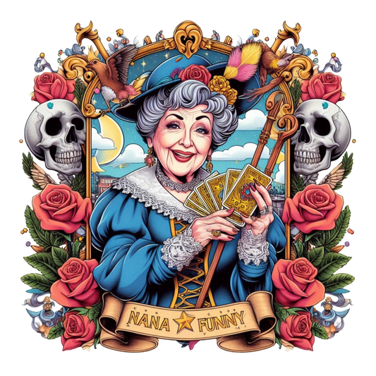 Regular price From £0.74 GBPRegular priceUnit price / per£2.38 GBPSale price From £0.74 GBPA vibrant, playful illustration of a whimsical elderly woman in blue attire, holding playing cards, surrounded by roses and skulls. dtf prints